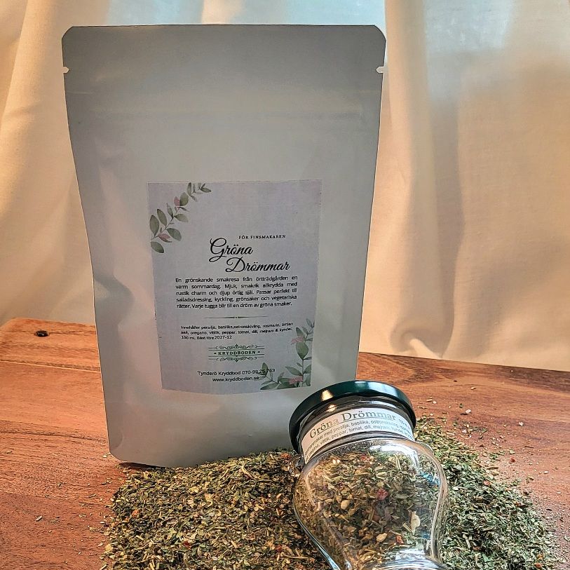 Sommarens solvarma smaker från kryddträdgården hittar du i Gröna Drömmar. Med sin mjuka, örtrika smak är den perfekt till salladsdressingar, kyckling, grönsaker, vegetariska rätter och pizza. Varje tugga blir som en dröm av gröna smaker.